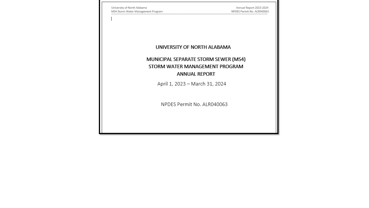 The University of North Alabama has been issued a National Pollutant Discharge Elimination System (NPDES) permit for storm water discharges from regulated small municipal separate storm sewer systems (MS4). The Department of Environmental Health and Safety (EHS) is responsible for management of the Storm Water Management Program Plan (SWMPP).
