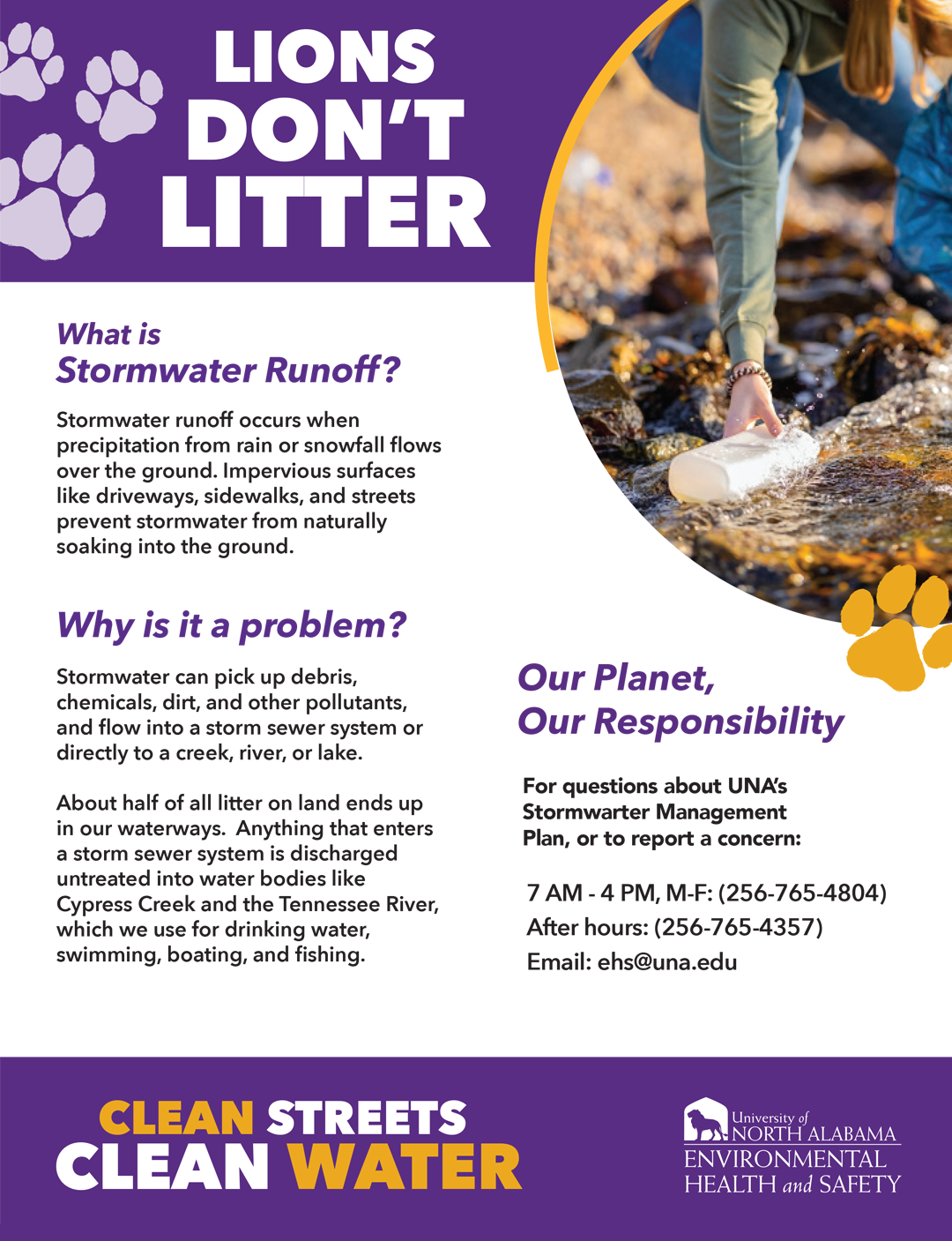If you wish to report a storm water concern or potential illicit discharge on the university's property, send an email to: ehs@una.edu