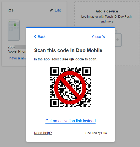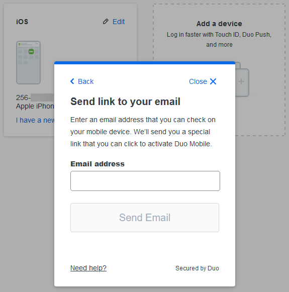 If you have trouble with the QR code, you can click on the activation link instead. This will take you to a new window where you can enter an email address to send the activation code. Access the email from the same device where you have Duo Mobile installed.