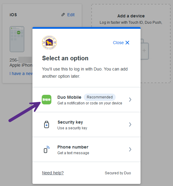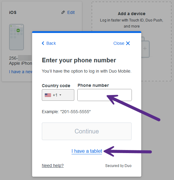 Once you have verified your identity and chosen to add a device, select the "Duo Mobile" app option to log into your Duo Mobile account using the app. If you are adding a second phone number, continue to enter it on the following page. Click the "I have a tablet" link to add a tablet. For this example, we will add a tablet.