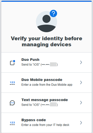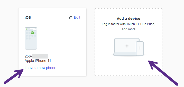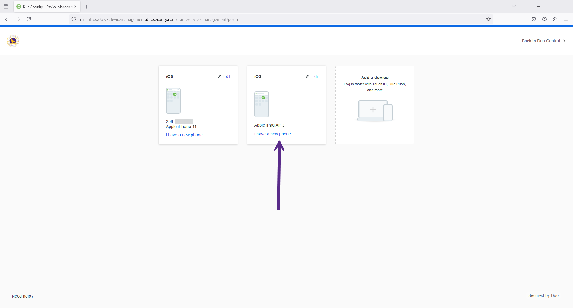 Visit una.login.duosecurity.com and login with your UNAPortal username and password. Once logged in (you may need to accept a Duo push to your device), click on the Manage Devices link at the top-right of the page. You will be prompted to log in with your UNA username and password again. You will be prompted to verify your identity before managing your devices.