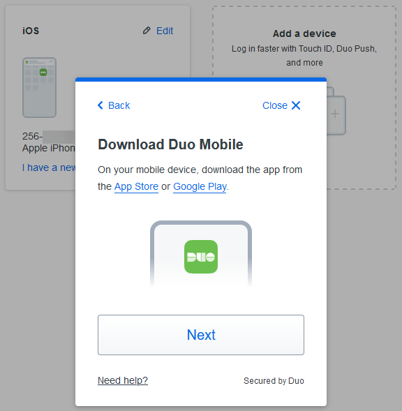 Download the Duo Mobile app on your Apple or Android tablet. You can search for the app in your device's app store. The window also contains links to the app store page (Apple Store and Google Play) to help you identify the correct app. Click on the "Next" button to continue.