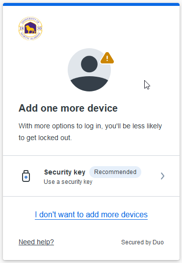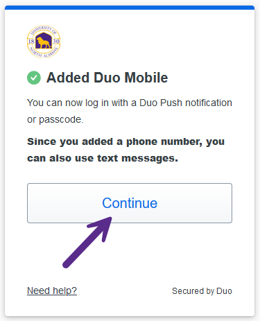 Once you have activated your Duo Mobile account, click the "Continue" button. If you have more devices to add, you can do so in the next window or click the "I don't want to add more devices" link.
