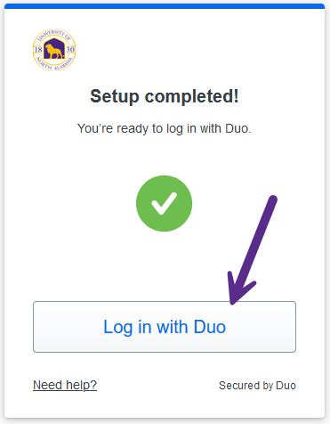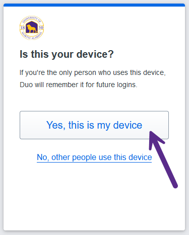 Your Duo setup should be complete! Click on the Log in with Duo button to have a push sent to your device. If it is a personal device that only you use, you can click on the "Yes, this is my device" button.
