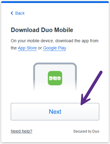 Download the Duo Mobile app on your Apple or Android smartphone. You can search for the app in your device's app store. The window also contains links to the app store page (Apple Store and Google Play) to help you identify the correct app. Click on the "Next" button to continue.