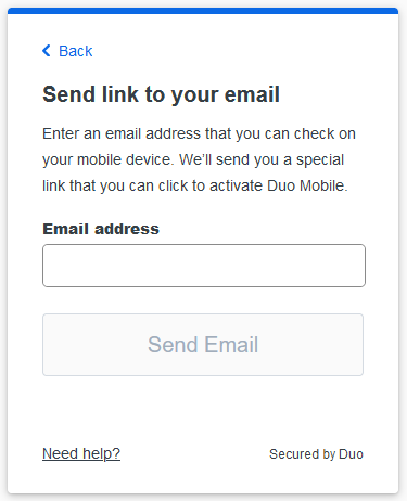 If you have trouble with the QR code, you can click on the activation link instead. This will take you to a new window where you can enter an email address to send the activation code to. Access the email from the same device where you have Duo Mobile installed.