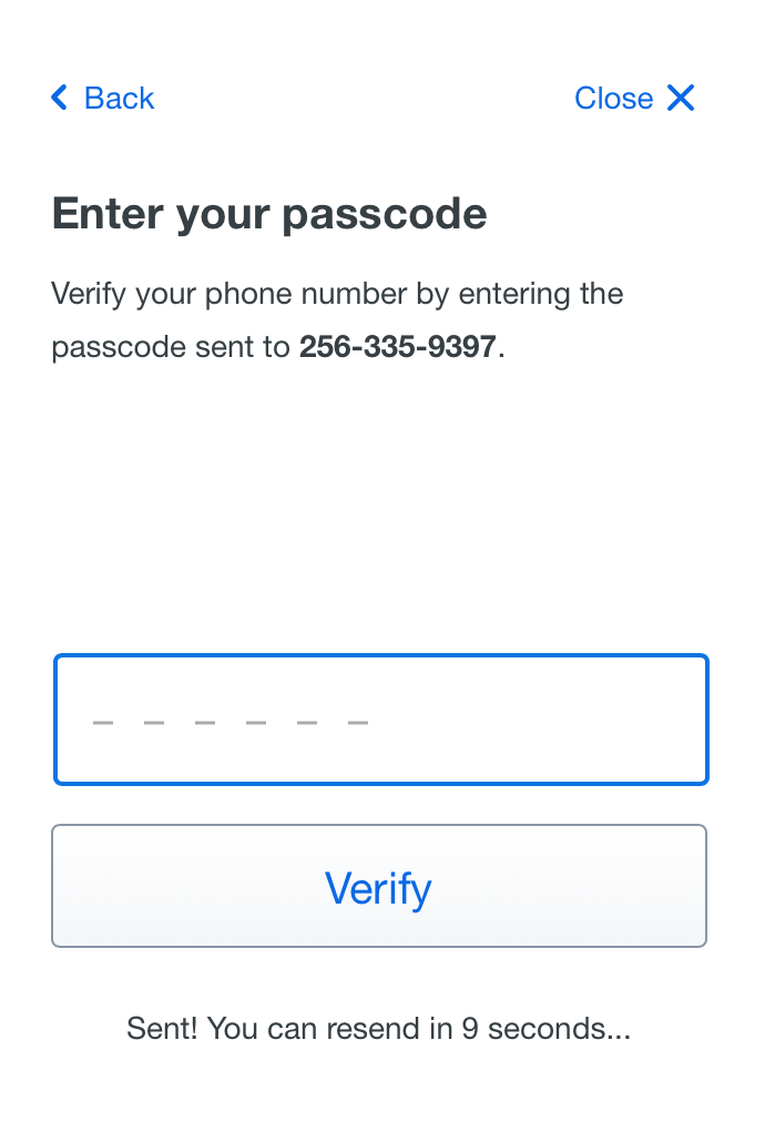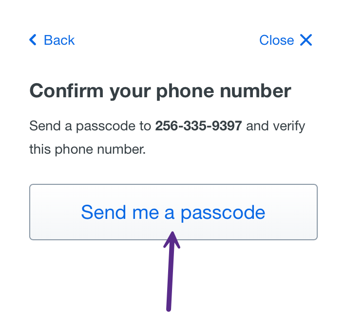 Step 5 - Confirm phone number/Send me a Passcode