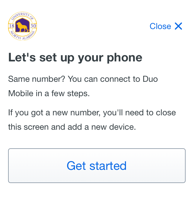 Locate your phone in the list of devices on your account and click on the "I have a new phone" link." Click the "Get started" button on the next screen to connect your new phone to Duo Mobile.