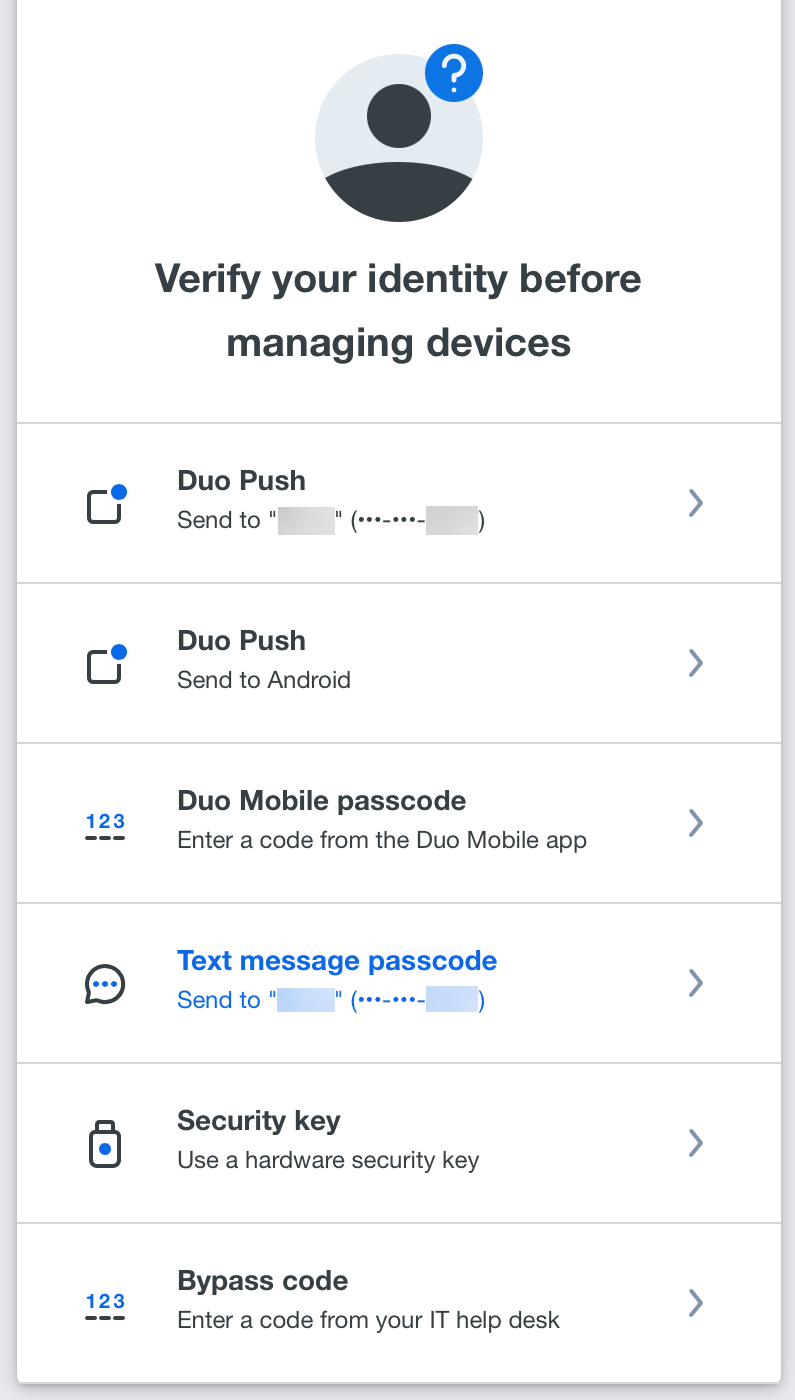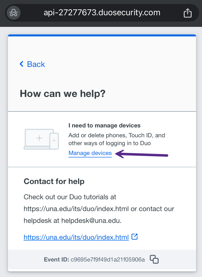 In the "How can we help?" window, click on the "Manage devices" link found in the "I need to manage devices" section. You will be prompted to verify your identity before managing your devices.