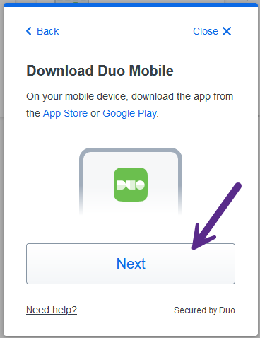 Download the Duo Mobile app on your Apple or Android smartphone. You can search for the app in your device's app store. The window also contains links to the app store page (Apple Store and Google Play) to help you identify the correct app. Once the app is installed, click on the "Next" button to continue.