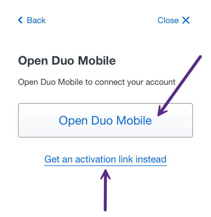 Click on the "Open Duo Mobile" button to open the Duo Mobile app to activate your account. You can also click the "Get an activation link instead" link to get a Duo activation link.